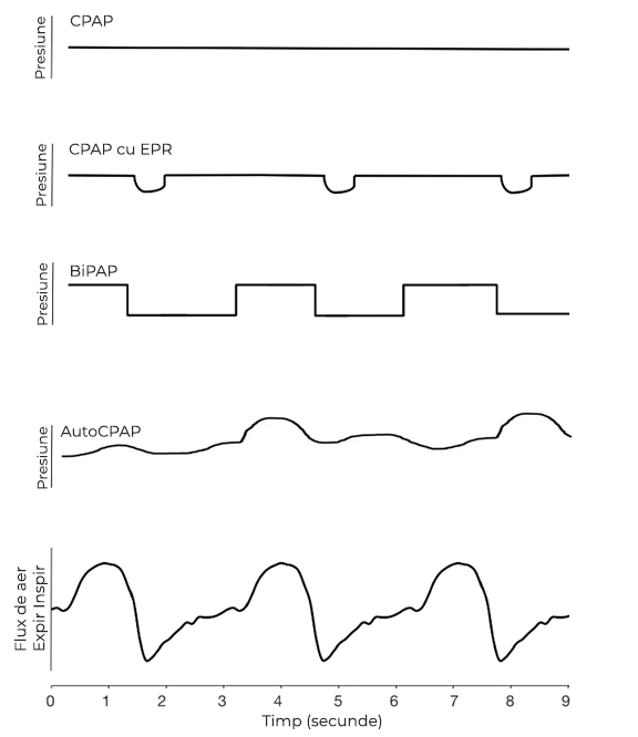 Ca și perspectivă vizuală asupra modului în care fiecare tip de aparat gestionează presiunea aerului și influențează ciclul respirator, se poate utiliza graficul următor pentru a ne ajuta să înțelegem mai bine diferențele subtile, dar cruciale, dintre aceste tehnologii.
